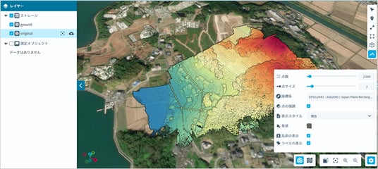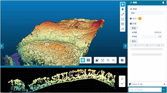 ・ビューア機能(点群データ): クラウド上で、三次元点群データの編集や測定ができるツールです。地形や建物などの詳細な3Dモデルを生成し、精密な計測が可能になります。