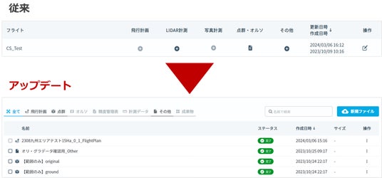 測量に関する飛行計画や点群などのデータを一覧表示し、閲覧、削除、ダウンロードが可能になったことで、効率的に管理することができます。従来、複雑だった飛行計画や点群データの確認フローを、操作性が良いUIに改善しました。