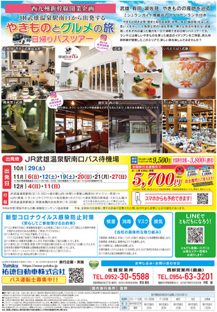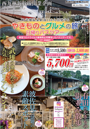 9月23日に西九州新幹線(武雄温泉⇔長崎間)の開業により、佐賀県の武雄温泉駅と長崎駅を最短23分で結び、九州地域全体の活性化を図る交通インフラとして期待されています。今回、西九州新幹線開業企画として、JR武雄温泉駅南口バス停から発着する、「やきものとグルメの旅」日帰りバスツアーを開催します。