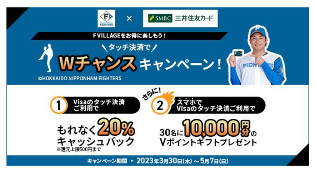 SMCCは、FビレッジにおけるVisaのタッチ決済リリースを記念したキャンペーンを実施いたします。是非この機会にFビレッジでタッチ決済を利用して、お得にお買い物をお楽しみください。詳細は、ホームページ(https://www.smbc-card.com/mem/cardinfo/cardinfo7223086.jsp)をご確認ください。