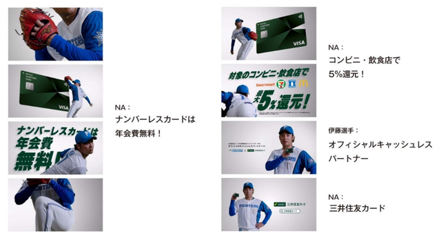 三井住友カードが発行する三井住友カード(NL)、三井住友カード ゴールド(NL)、三井住友カード プラチナプリファードは、対象のコンビニ・飲食店にて、Visa のタッチ決済やMastercard(R)コンタクトレスでお支払いいただくと、ポイントが最大 5%還元される、日常使いにとても"便利"で"お得"なクレジットカードです。今般、ファイターズファンの皆様に向けて、伊藤大海選手の躍動感溢れるピッチングシーンと共に、三井住友カード(NL)の「便利」「お得」を訴求していきます。