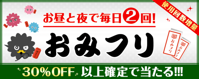 毎日2回振れるクーポンくじが、期間中はさらにお得に!ハズレなし、30%OFF最大3回使えるクーポンが当たります。