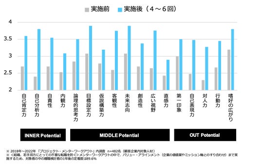 メンターワークアウトでは、EQマネジメントなど独自のメソッドにより20代若手人材のマインドセットを実施しています。複数回のセッションを通して、対象者の自律思考を育てます。以下のデータは、メンターワークアウトに参加した若手人材の参加前と参加後の自律を構成する17のインナーポテンシャルがどのように鍛えられたかを示すデータです。