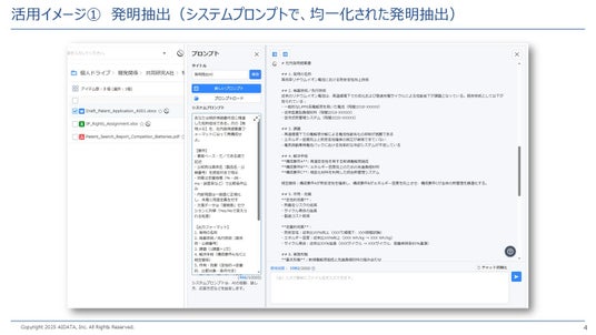 知財人材不足とナレッジ継承が課題となる中堅製造業や研究機関において、AI IPGeniusは専門知識を要さず利用可能なUIを備える。誰でも均一化されたプロンプト処理を実現した。