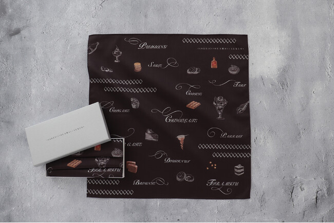 CLASSICS the Small Luxury (クラシクス・ザ・スモールラグジュアリ)は、東京、日本橋人形町を拠点に日本のハンカチーフ業界のパイオニアである、繊維製品企画販売のブルーミング中西株式会社(本社 東京都 中央区 取締役社長 中西一) が運営するハンカチーフ専門店です。2024年1月12日(金)より、バレンタインデーに先立ち、11種類のスイーツを描いた新作ハンカチーフを発売します。毎年人気の板チョコモチーフの限定ラッピングも登場します。