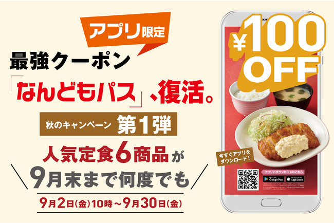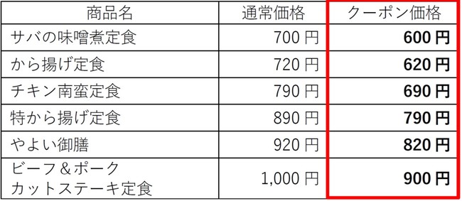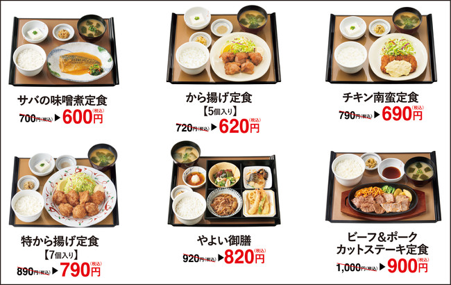 第1弾は、9月2日(金)10時より30日(金)までの期間中、『サバの味噌煮定食』600円や『から揚げ定食』620円、『チキン南蛮定食』690円などの6定食を、お得な特別価格でお楽しみいただけます。第2弾の配信もご期待ください。