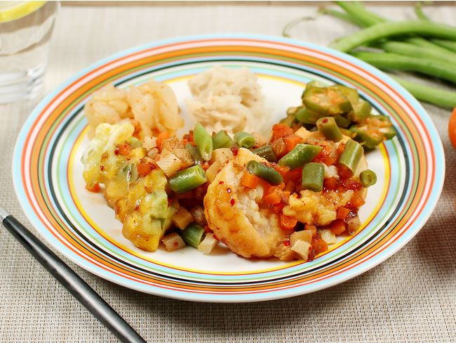 副菜は、玉ねぎの辛味あえ、大根の胡麻マヨ、オクラのチリソースです。