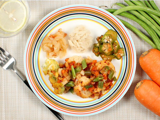 ふわふわのエビフリッターとコーンとアスパラの寄せ揚げに、香味野菜がたっぷり入ったピリッとスパイシーなソースをかけました。インゲン、タケノコ、人参をいろどりよく散らしております。ソースと具材をよく絡めてお召し上がりください。