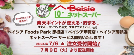 株式会社ベイシア(本社:群馬県前橋市、代表取締役社長:相木孝仁)は、楽天グループ株式会社(以下「楽天」)が提供するネットスーパーのプラットフォーム「楽天全国スーパー」内に出店する「ベイシアネットスーパー」において、ベイシア Foods Park彦根店・ベイシア甲賀店、ベイシア蒲郡店からの配送を2024年7月9日(火)より開始いたします。「ベイシアネットスーパー」は開業から約2年で計47店舗の展開となります。