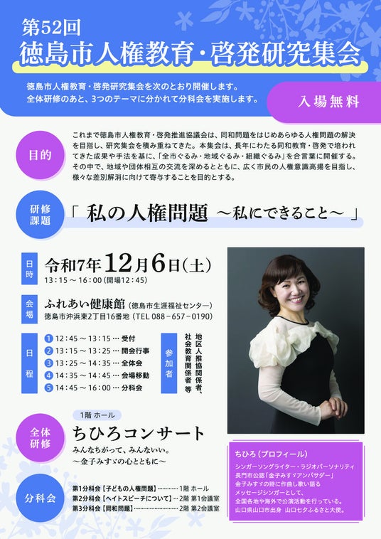 徳島市人権教育・啓発研究集会を次のとおり開催します。全体研修のあと、3つのテーマに分かれて分科会を実施します。