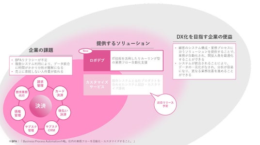 株式会社ROBOT PAYMENT(本社:東京都渋谷区、代表取締役:清久 健也、以下 当社)は、2023年12月期通期決算(2月14日発表)にて、BPA(※1)を支援するBPaaS(※2)事業の開始を発表しました。第一弾として、業務フロー自動化支援サービス「ロボデブ」の提供を開始し、企業のDX推進を包括的に支援します。