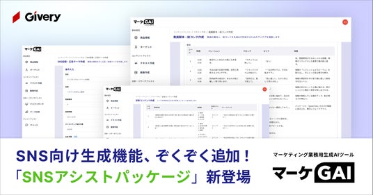 企業の生成AI活用支援とマーケティングDX支援サービス「DECA(デカ)」を展開する株式会社ギブリー(本社:東京都渋谷区、代表取締役社長:井手高志、以下当社)は、運営するマーケティング業務用生成AIツール「マーケGAI(マーケジーエーアイ)」において、2024年10月17日より、Instagram、X(Twitter)、Youtube、LINEなどの運用業務を効率化する実用的なSNSコンテンツ生成機能「SNSアシストパッケージ」を追加します。