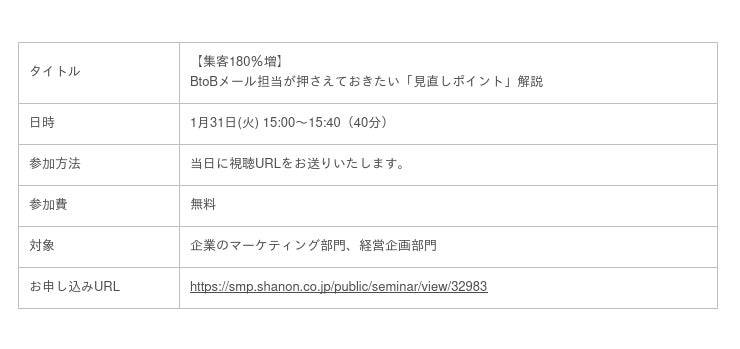株式会社シャノン(本社:東京都港区、代表取締役社長:中村 健一郎)は、シャノンのメール実務担当者が培ってきたノウハウのなかでも「ここだけは押さえておきたい見直しポイント」を厳選しご紹介するウェビナーを1月31日(火)に開催します。