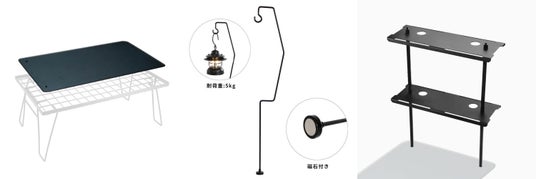 熱い鍋を置くことができる鉄製天板や高さ53cmのマグネット式ランタンスタンド、調味料や小物用の収納に便利なシェルフのオプションも充実。