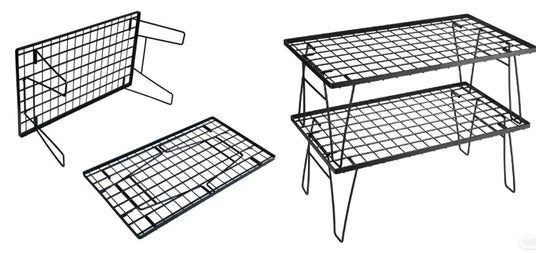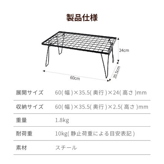 タフなスチール製で重量1.8kgと女性でも運びやすく、まとめて購入してもお財布に優しいのがキャンキャンパーのフィールドラックです。スタッキングすれば腰を曲げずに作業ができ、収納時は厚さ2.5mmになるため場所を取りません。