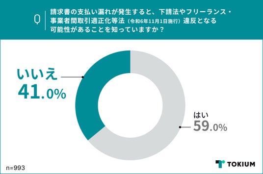 また、請求書の支払い漏れなどにより、期日までに支払いが行われなかった場合は、下請法や2024年11月1日施行予定のフリーランス・事業者間取引適正化等法に違反する可能性があります。41%がこのリスクについて認識していないことがわかりました。