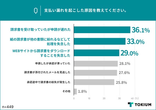 その原因としては、「請求書を受け取っていたが申請が遅れた(36.1%)」という回答が最も多く挙げられました。ついで「紙の請求書が他の請求書に紛れるなどして処理を失念した(33.0%)」、「Webサイトから請求書をダウンロードすることを失念した(29.0%)」という結果でした。