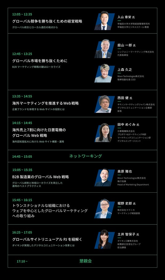 B2B 製造業におけるグローバル展開に向けた Web 戦略に取り組まれている有識者をお招きした全7つのセッションを予定しています。