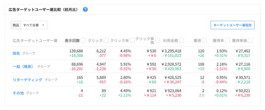 広告グループを、「指名」「一般(検索)」「リターゲティング」「その他」のカテゴリに分類し、各グループごとの配信データを把握できます。