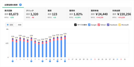 複数の媒体から収集されたデータを、統合されたレポート形式で可視化し、これにより、Web広告全体の配信状況や獲得状況を簡潔に把握することが可能となっています。