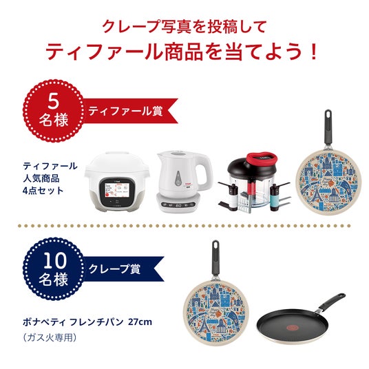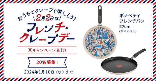 ティファールでは、「フレンチ・クレープデー」を楽しんでいただくキャンペーンを、InstagramとX(旧Twitter)で実施しています。Instagramでは、おうちでクレープ作りを楽しんでいる写真を投稿していただいた方の中から抽選でティファール商品をプレゼントします。Xでは新発売の「ボナペティ フレンチパン 27cm」を使って、おうちクレープを楽しみたい方20名様を募集するキャンペーンを実施いたします。