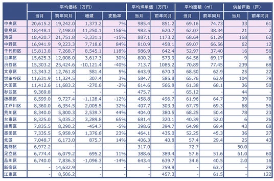 東京23区の各行政区毎に、平均価格、平均坪単価、平均面積、供給戸数をまとめました。当月の平均価格が大きい順に表示しています。