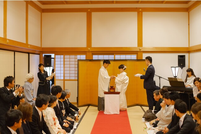 ささやま祝言では、大書院を舞台に「日本ならではの婚礼の儀式」に則り挙式を執り行います。お二人が契りを交わし、ご家族やゲストの皆様が縁を繋ぐ、何年経っても色褪せない一日を、歴史ある空間が演出します。