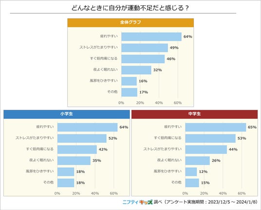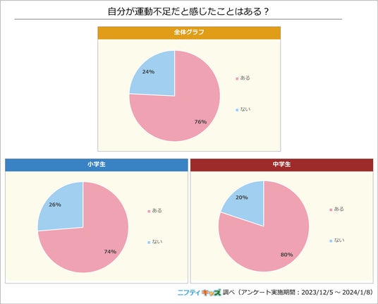 全体の76%が「ある」と回答しました。小学生だけを見ると74%、中学生では80%の人が自分を運動不足と感じていて、中学生の方が小学生よりも運動不足を実感している人が多いことがわかりました。