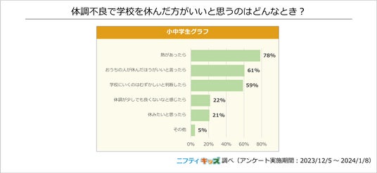 約8割の人が「熱があったら」学校を休んだ方がいいと回答しました。「おうちの人に言われたら」、「学校に行くのが難しいと判断したら」と考えている人もいるようです。