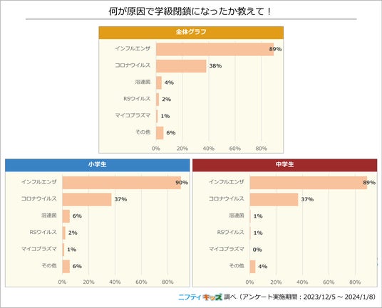 学級閉鎖があったと回答した人のうち、全体で90%の人が原因は「インフルエンザ」と回答しました。