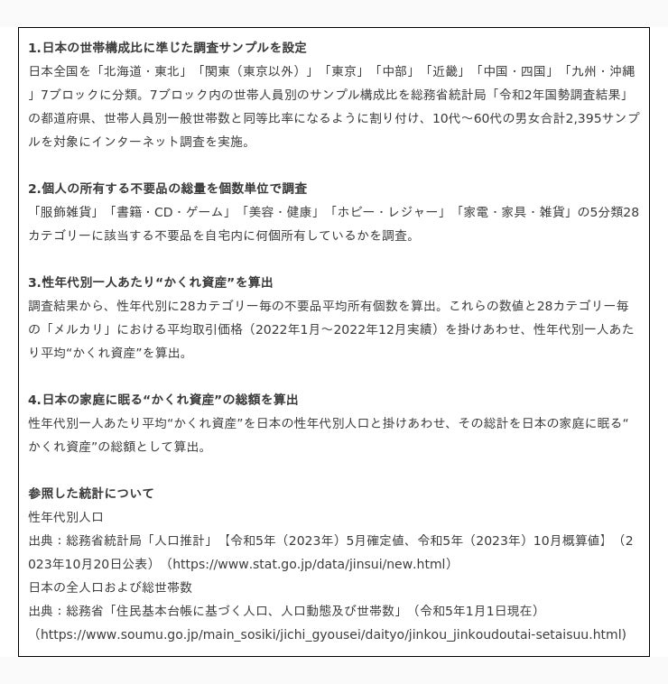 株式会社メルカリ(以下、メルカリ)は、ニッセイ基礎研究所 生活研究部 上席研究員 久我 尚子氏監修のもと、「2023年版 日本の家庭に眠る“かくれ資産”」に関する調査を実施しました。