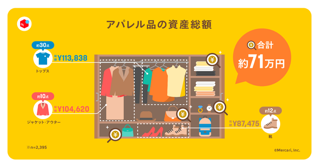 現在家庭で保管しているアパレル品の数量を調査しました。“かくれ資産”と同様に、その数量と「メルカリ」の平均取引価格を掛けあわせ、保有しているアパレル品の金額を算出したところ、1人あたり約71.2万円となりました。