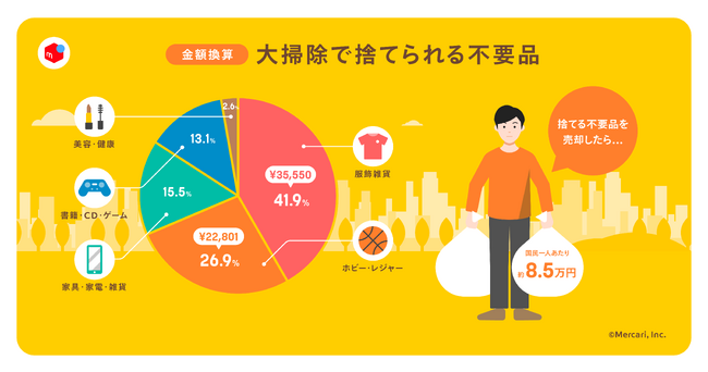 現在家庭にある不要品のうち、年末年始の大掃除などで、今後捨てる予定の不要品の数量を調査しました。その数量と「メルカリ」の平均取引価格を掛けあわせ、捨てる予定の不要品の金額を算出したところ、国民一人あたり平均約8.5万円となりました。