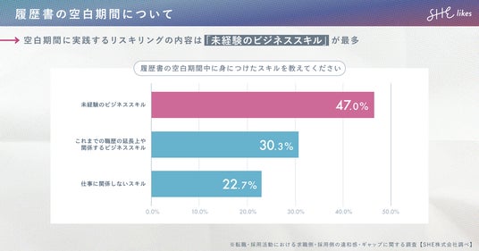 空白期間に実践したリスキリングを聞くと、「未経験のビジネススキル」と回答した人が47.0%がトップで、半数の人が新たなスキルを身につける機会にしていることがわかりました。