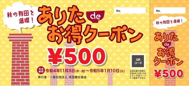 佐賀県有田町と有田観光協会は、新型コロナウイルスにおける町内事業者への支援策として、2022年11月3日(木・祝)から「秋の有田を満喫!ありたdeお得クーポン券」を発行します。