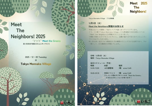いちごが保有するオフィスと商業の複合ビル「Tokyo Monnaka Village」にて、テナント様や近隣の皆さまをつなぐ「お隣りさん同士の交流会」イベントとして、「Tokyo Monnaka Village - Meet The Neighbors!」を2025年12月9日に開催しました。Tokyo Monnaka Villageは、いちごのオフィスブランド「Villageシリーズ」であり、ご入居いただくテナント様や地域の皆さまと一つのコミュニティを形成することを目指しております。