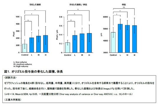 軟骨細胞が成長と共に骨化することが、骨伸長に重要であることが知られています。成長期のモデルであるゼブラフィッシュ幼魚にオリゴミルを与え、3週間後の骨および体長を観察しました。その結果、オリゴミル投与無しの対象群と比較して、オリゴミル投与群では、軟骨組織を増大させ、骨化した面積が増えること、個体の体長が増大することが確認されました。