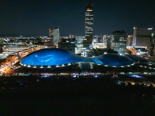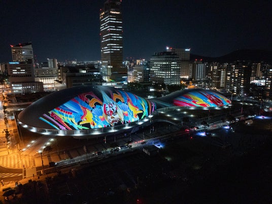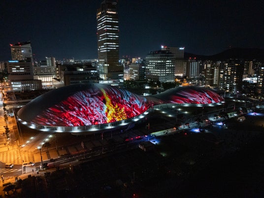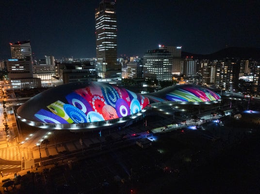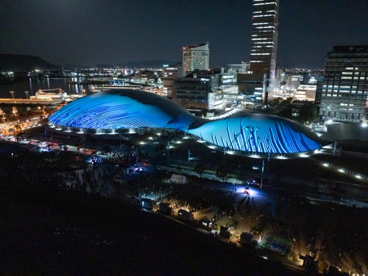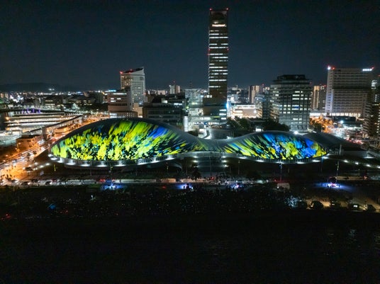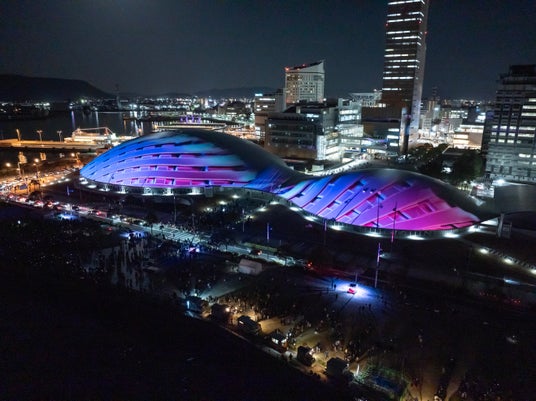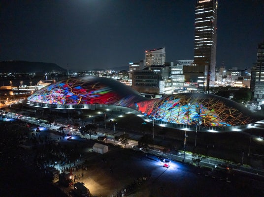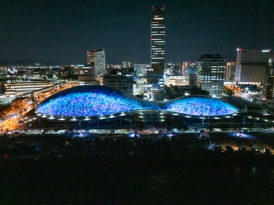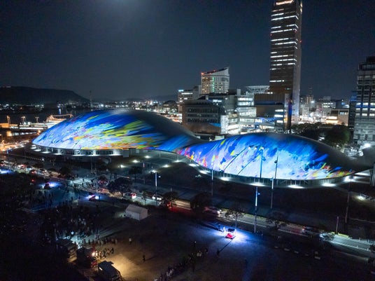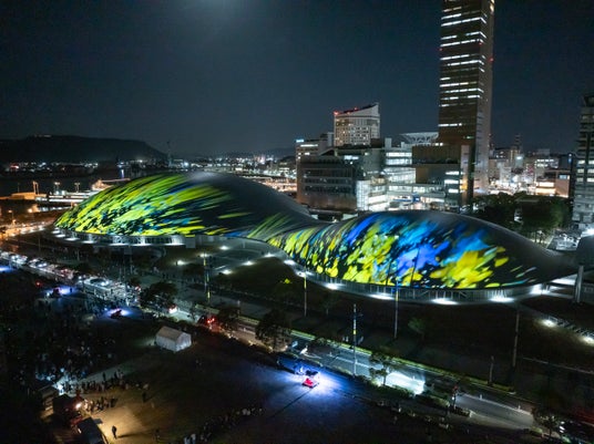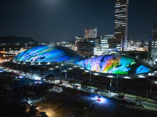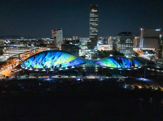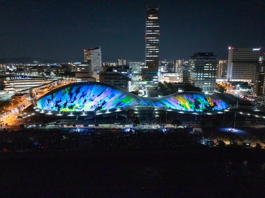 【内容】 2025年2月に開業した中四国最大級のアリーナ・あなぶきアリーナ香川(香川県立アリーナ)のメインアリーナ・サブアリーナの幅約200mにおよぶ屋根に、宇宙や地球、瀬戸内の自然、香川の伝統文化などをモチーフにしたデジタルアニメーションのプロジェクションマッピング映像を投影しました。