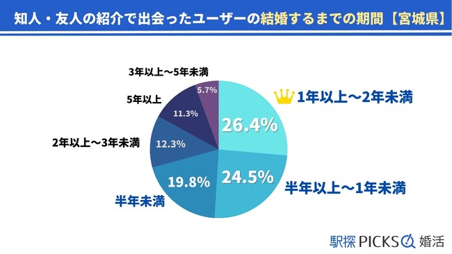 知人や友人からの紹介がきっかけで結婚に至る人が多い宮城県。その中で結婚に至った期間を割り出してみると、1位は「1年以上~2年未満」で26.4%、2位が「半年以上~1年未満」で24.5%となりました。