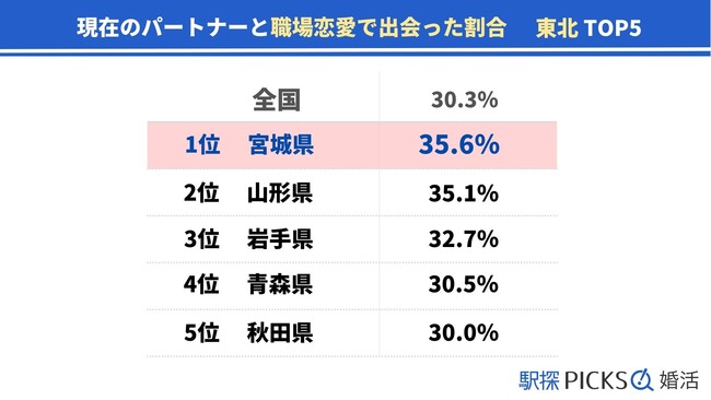 現在のパートナーと「職場恋愛」で出会った割合、宮城は東北で1位