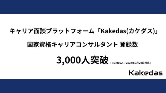 企業向けの教育研修事業と若年層向けの就職支援事業を展開する株式会社ジェイックの子会社である、国内最大級のキャリア面談プラットフォーム「Kakedas(カケダス)」を運営する株式会社Kakedasは、この度、キャリア面談プラットフォーム「Kakedas(カケダス)」に登録する、国家資格キャリアコンサルタントが3,000人を突破(※1)したことを発表します。(※1)3,016人/2024年9月20日時点