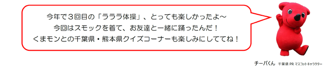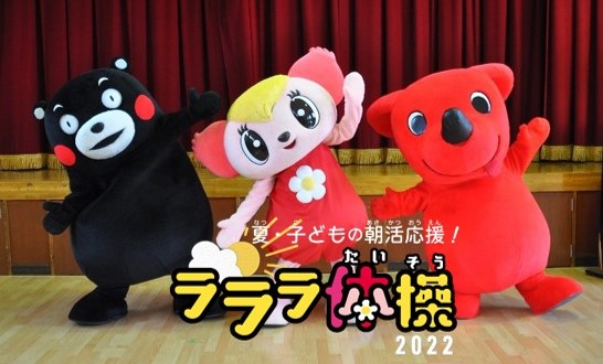 この度、「ラララ体操」に遊びに来てくれるゲストキャラクターが決定しました。期間中にポンちゃん、長草くん、くまモン、チーバくんが登場しララちゃんと一緒に「ラララ体操」を行います。