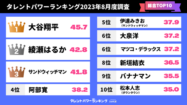 「タレントパワーランキング」2023年8月度調査(第3四半期)の総合トップ10を発表!