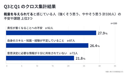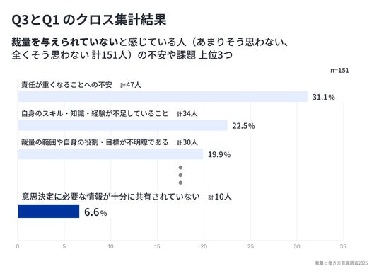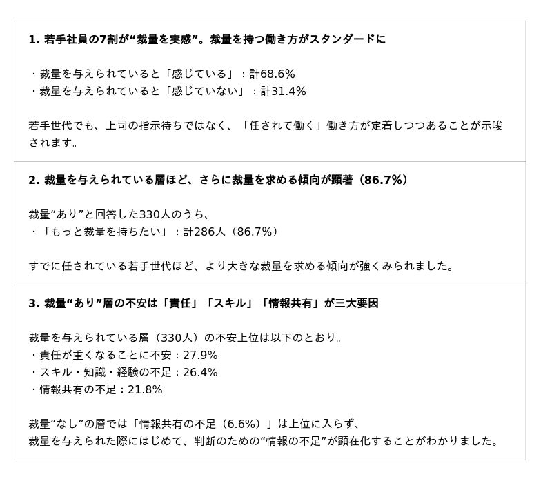 その結果、若手の約7割(68.6%)が「職場で裁量を実感している」と回答し、さらに裁量を与えられている層ほど、「もっと裁量を持って働きたい」という意欲が強い(86.7%)ことが明らかになりました。一方で、裁量を発揮する際の課題としては、「責任が重くなる不安」「スキル不足」「情報共有の不足」が上位に。