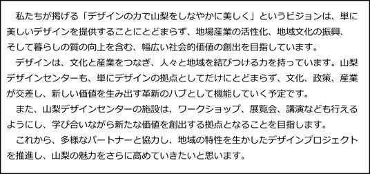山梨県(知事:長崎幸太郎)は本年11月、県のデザイン推進拠点として、県立美術館附属『山梨デザインセンター』を県庁舎内に開設します。