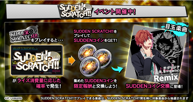 イベント期間中、KILLER SCRATCH!!をプレイするとライズ消費量に応じた確率でSUDDEN SCRATCH!!が発生します。SUDDEN SCRATCH!!をプレイすると、通常の報酬アイテムの他、限定アイテム「SUDDENコイン」を獲得することができます。「SUDDENコイン」を集めることで、新楽曲「チグリジア(A.R.B remix)」と交換することが可能です。詳細はアプリ内お知らせをご確認ください。