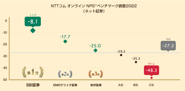 ネット証券会社6社のうち、NPSのトップはSBI証券(-8.1ポイント)、2位はGMOクリック証券(-17.7ポイント)、3位は松井証券(-25.0ポイント)となりました。トップ企業とボトム企業の差は40.2ポイント、6社のNPS平均は-27.3ポイントとなりました。