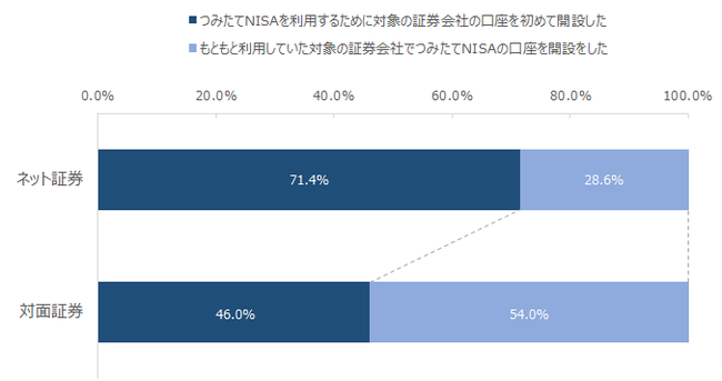 さらに、つみたてNISAの口座開設の仕方を調査したところ、「つみたてNISAを利用するために対象の証券会社の口座を初めて開設した」と回答した割合は、ネット証券においては71.4%、対面証券においては46.0%となりました。ネット証券においては、つみたてNISAが対象の証券会社における口座開設のきっかけになっている傾向が高いことがわかりました。