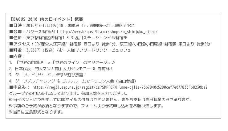 ダイヤモンドダイニンググループの株式会社バグース(本社:東京都港区、社長執行役員:矢口 健一)は、2月9日(火)19時よりバグース新宿西口店にて「2016 BAGUS 肉の日イベント」を開催する運びとなりました。会費3,500円で「世界の肉料理」と「世界のワイン」をビュッフェスタイル、フリードリンクで提供する他、ダーツや卓球、ビリヤードなどのアミューズメント施設を開放し自由に遊んでいただきます。イベント冒頭では参加者に日本代表「マンガ肉」を配り“肉乾杯”を行う他、特大サイズのマンガ肉で入刀セレモニーを行います。またドラコン大会やダーツブルチャレンジなど、盛り沢山の内容でイベントを楽しんでいただきます。