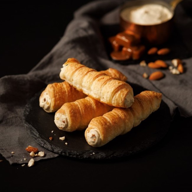 「葉巻」のように焼き上げたサクサクのパイの中に、ビターなキャラメルのクリームとローストしたアーモンドを閉じ込めました。